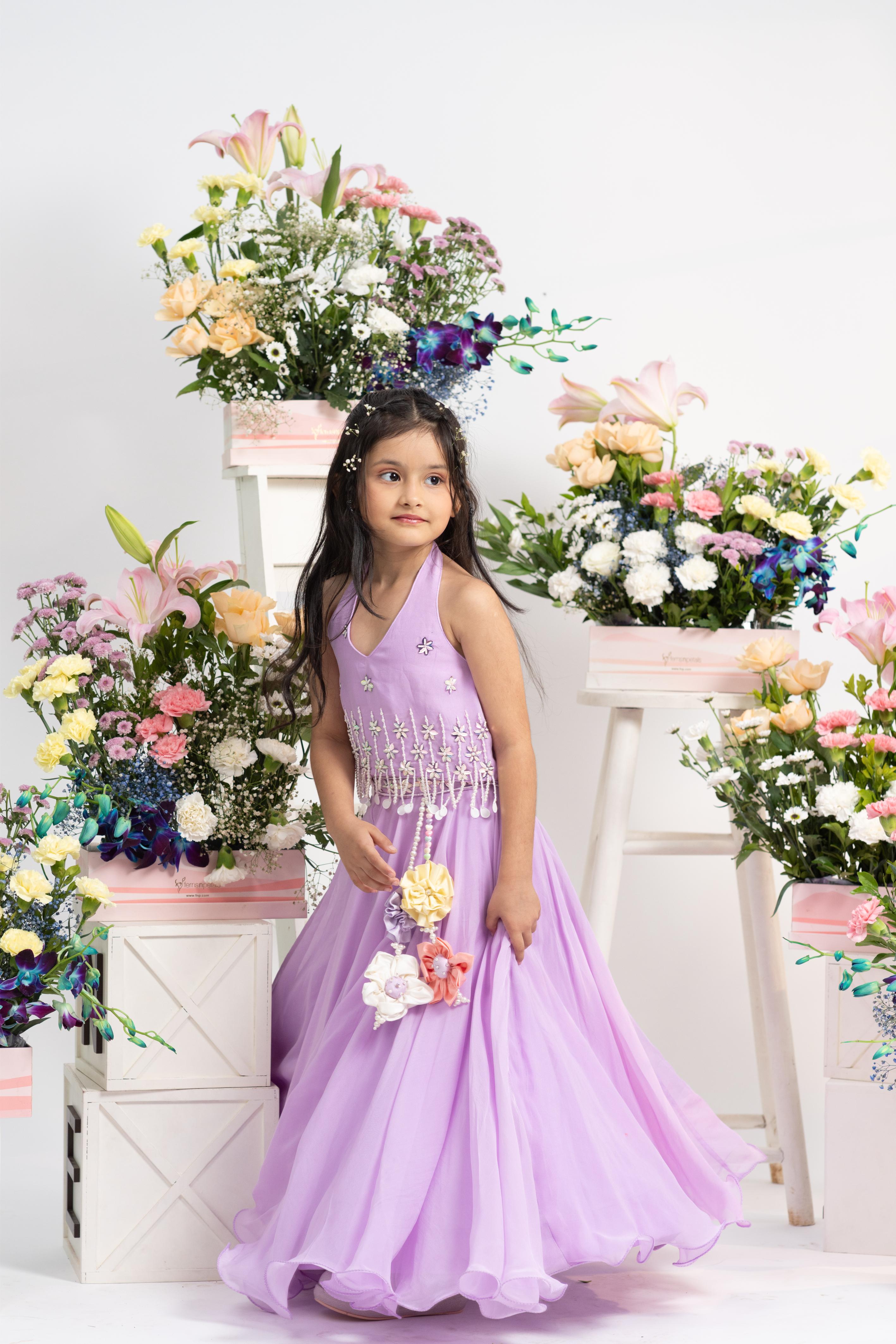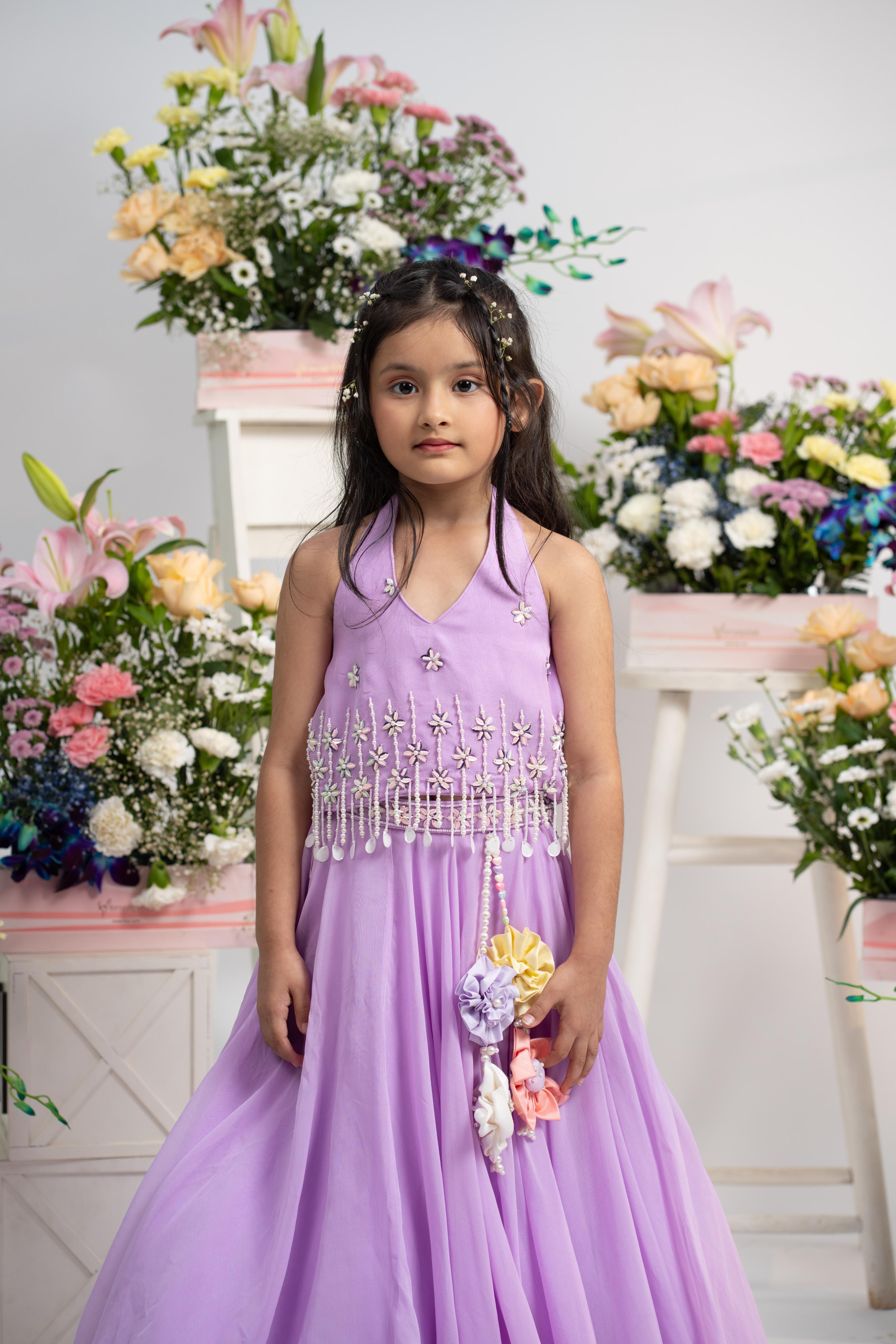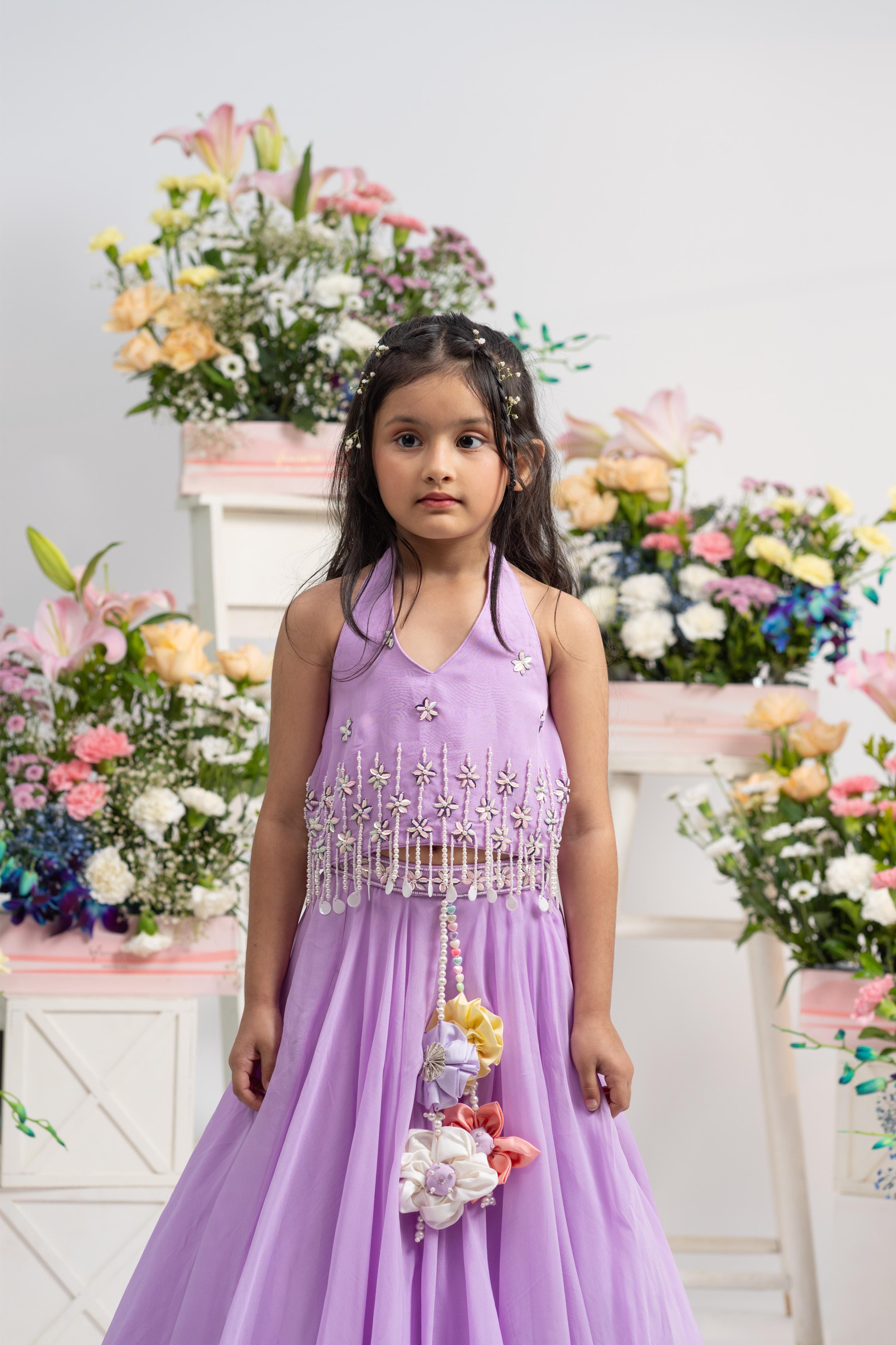 Flowing, full-flare lehenga in matching lavender hue