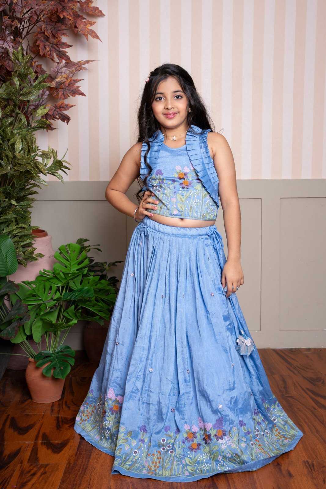 9-10 yrs Sky blue floral embroidered kurta set + 14-15 yrs Powder blue embroidered lehenga set with ruffle crop top