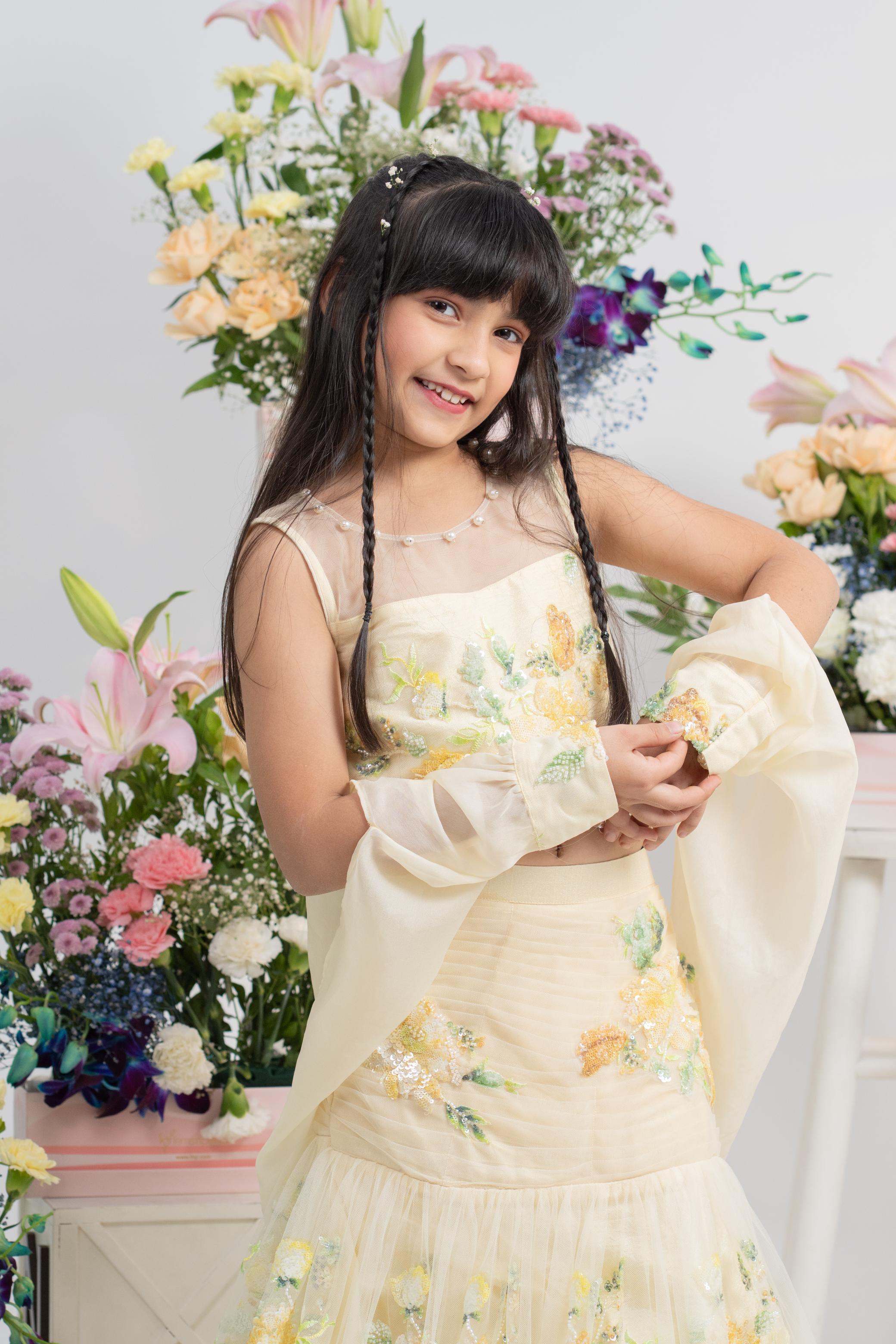Matching pastel yellow lehenga with layered net finish